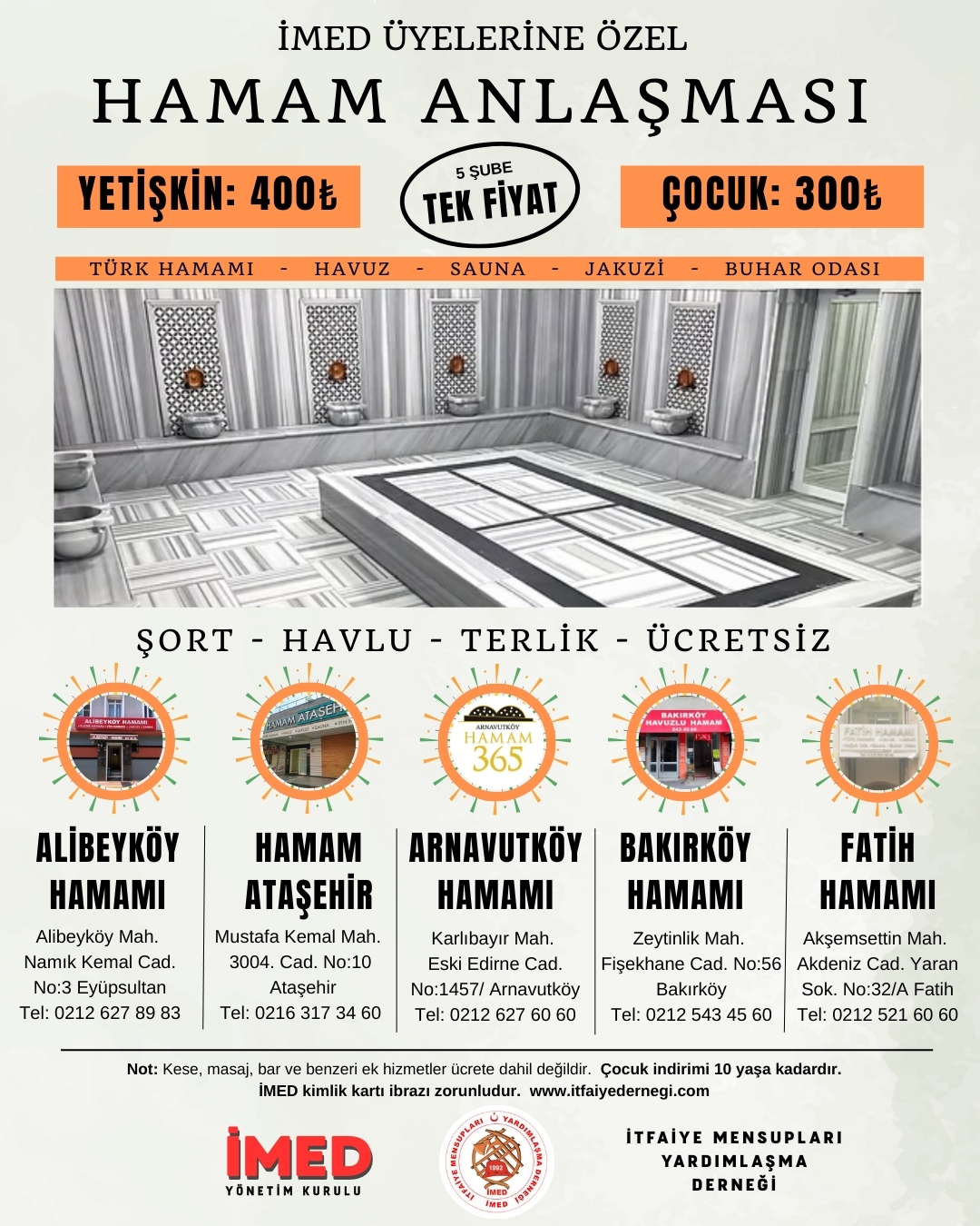 Hamam işletmeleri ile İMED derneğimiz arasında kurumsal indirim anlaşması yapılmıştır. Anlaşma kapsamında işletmenin 5 şubesindeb üyelerimiz ve 1. derece yakınlarına; yetişkin: 400 tl, çocuk: 300 tl...