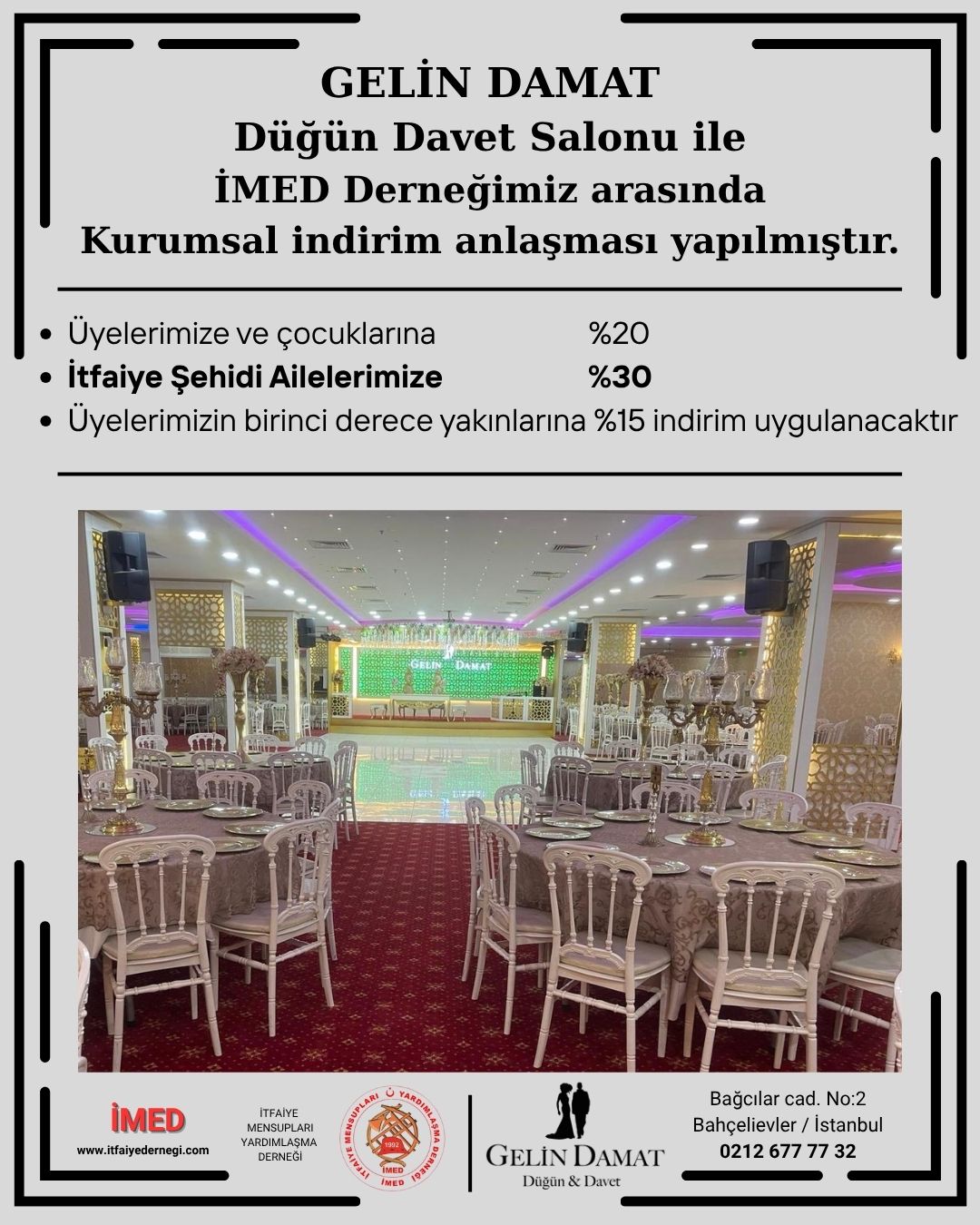 Gelin Damat Düğün Davet Salonu ile İMED derneğimiz arasında kurumsal indirim anlaşması yapılmıştır. Anlaşma gereği; imed üyelerimize ve çocuklarına % 20, itfaiye şehidi ailelerimize % 30...