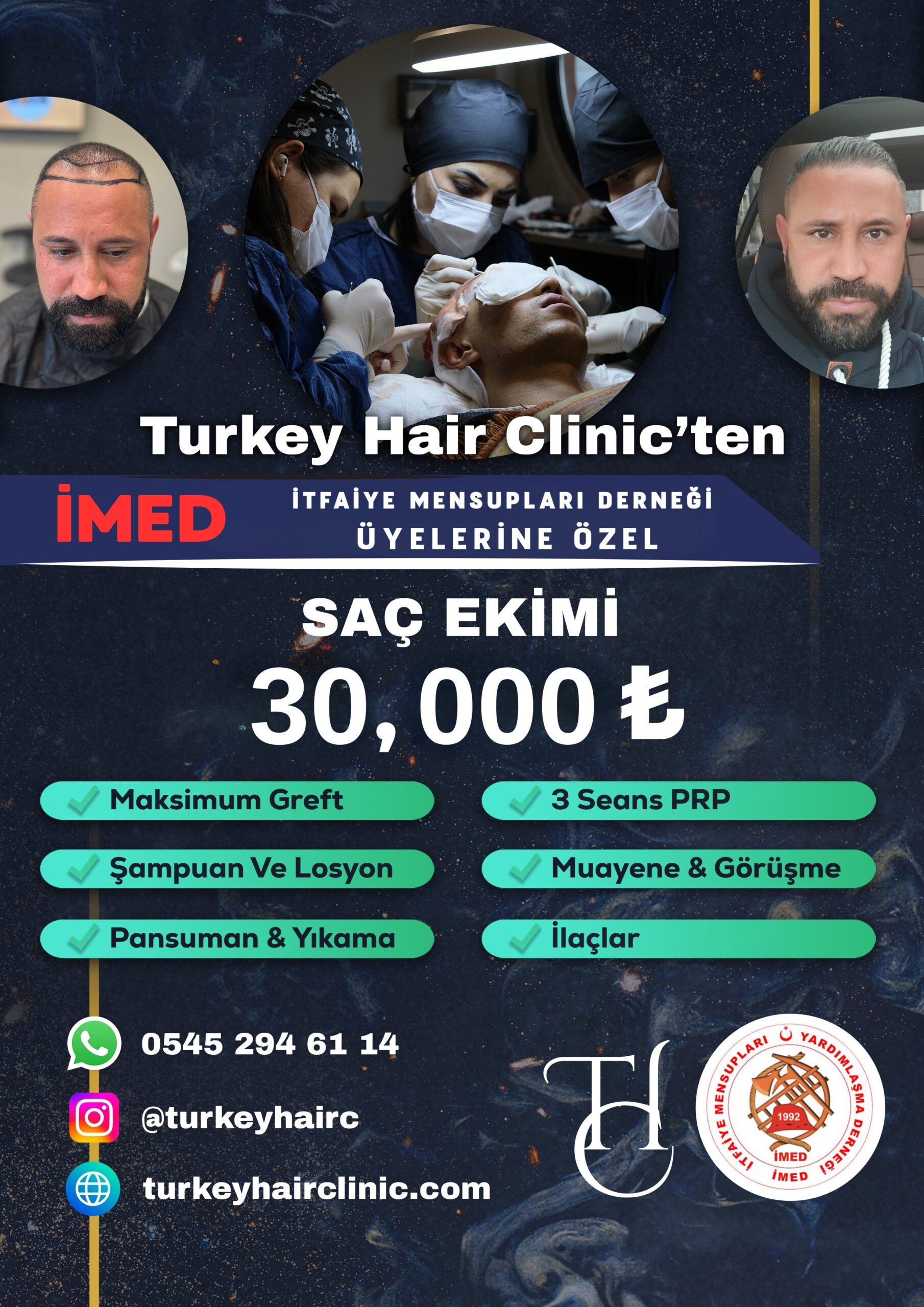 Turkey Hair Clinic Saç Ekimi Merkezi ile İMED derneğimiz arasında kurumsal indirim anlaşması yapılmıştır. Anlaşma gereği, üyelerimiz ve birinci derece yakınlarına saç ekimi hizmeti, 30 bin tl olarak...
