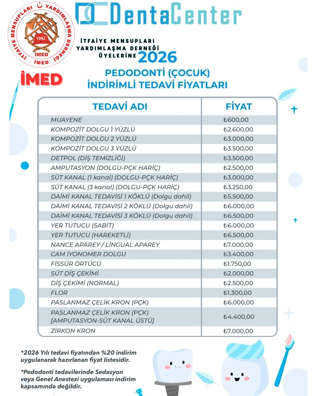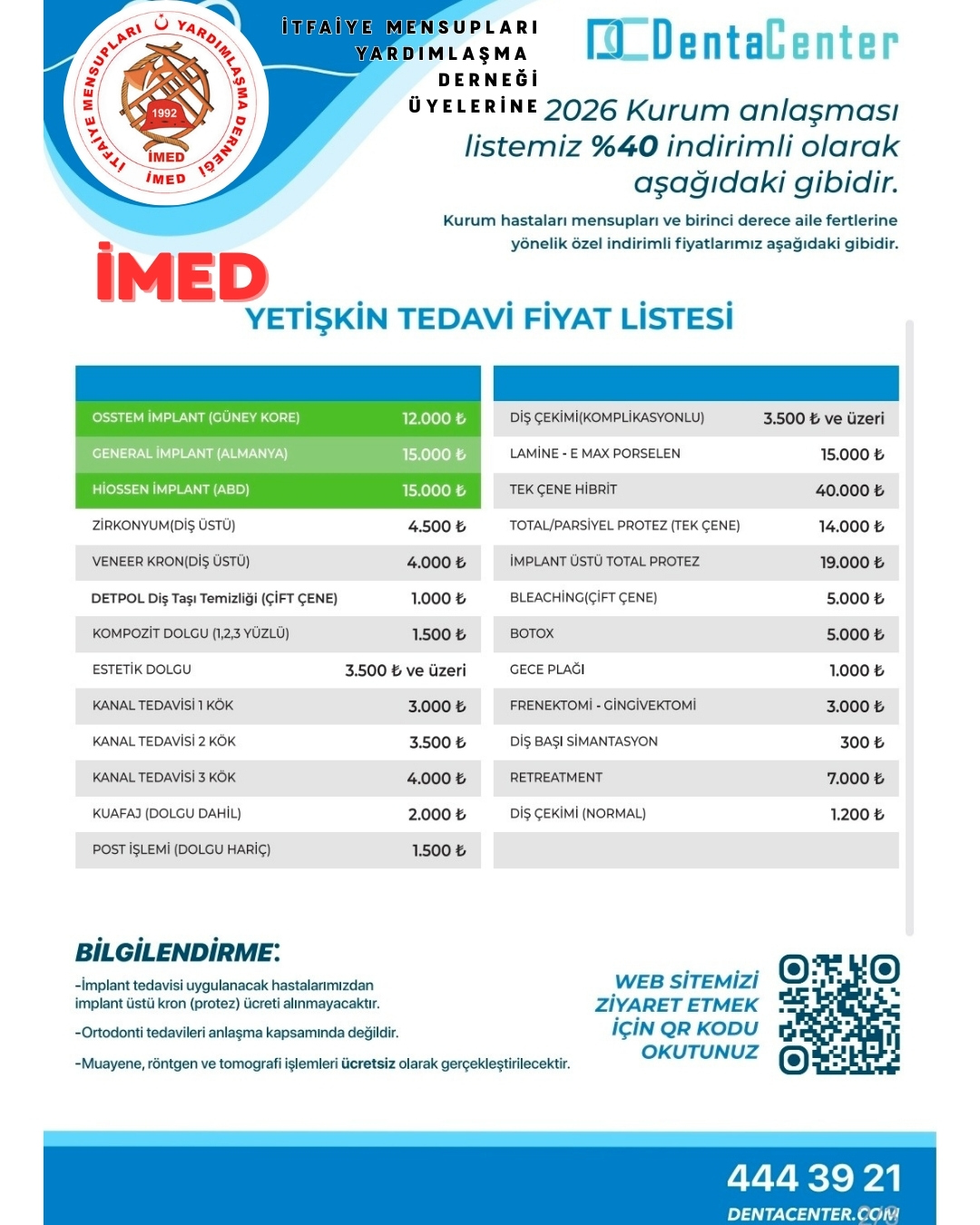 İstanbul’da Anadolu Yakası ile, Ankara Merkezli olarak faaliyet gösteren DENTACENTER şubeleri; yapılan Anlaşma gereği tüm üyelerimize ve 1. derece yakınlarına, listede belirtilen indirimli fiyatlar uygulanacaktır.