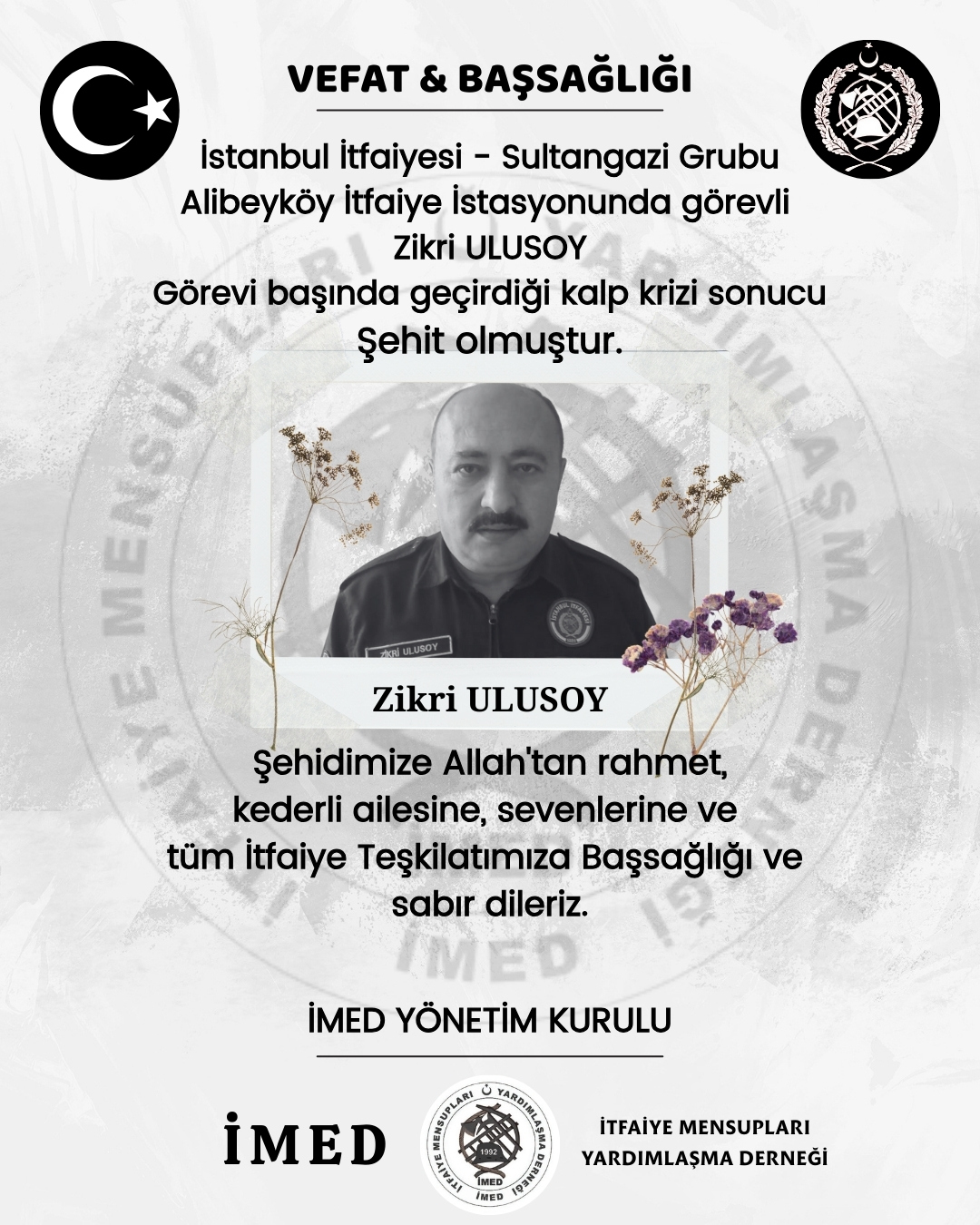 İMED İtfaiye Mensupları Yardımlaşma Derneği olarak; Şehidimize Allah’tan rahmet, kederli ailesine, yakınlarına ve tüm itfaiye teşkilatımıza Başsağlığı ve sabırlar dileriz.